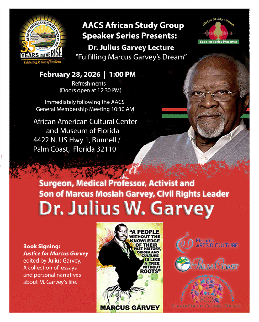 On February 28, 2026, at 1:00 PM, the Africa Study Group of the African American Cultural Society (AACS), hosts Dr. Julius Garvey for a, “Fulfilling Marcus Garvey’s Dream” presentation. Dr. Garvey, a surgeon, medical professor and activist and son of Marcus and Amy Garvey, discusses his father’s pan-African legacy, the @Justice4Garvey movement, and promoting self-reliance, unity, and African heritage.